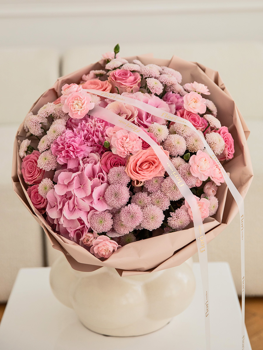 Bukiet kwiatów w różowym kolorze Mix. Kompozycja ze zdjęcia jest w rozmiarze „bardzo duży”.