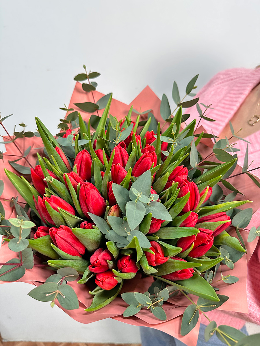 Букет тюльпанів з евкаліптом. Композиція на фото в розмірі “великий”.